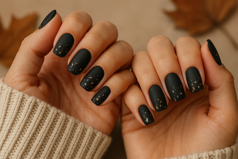 Start with an ink-black matte base and tap a few irregular gold specks near the cuticle or tip. Luxe without shouting, and the matte finish keeps it refined.