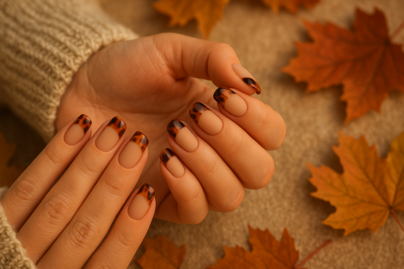 Keep the nail bed a sheer latte matte, then paint tortoise French tips using layered amber, brown, and a touch of black. Classic pattern, modern placement.