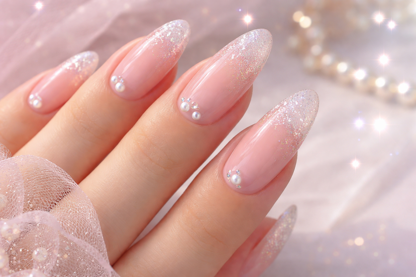 Start with a soft pink base, then add glitter only to the tips of your nails. Blend it slightly downward so it fades into the base color. This creates a subtle sparkle that looks magical but still wearable.