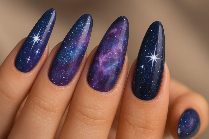 Blend deep purples, silvers, and dark blues to create a cosmic swirl. Add a few specks of white for a starry finish that glows under light.